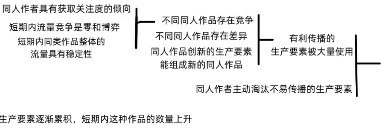 (短期内流量具有稳定性指:粉丝圈对作品提供流量的整体倾向在短期内不容易发生较大改变,同人作品几乎只在粉丝圈内传播的作品,稳定性由同类作品共同体现,不稳定性由单个作品体现。较短期内指:在生产技术没有进步的这段时间内)