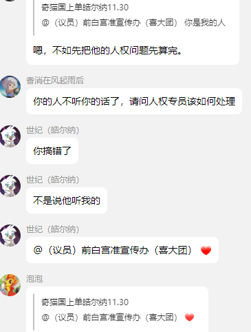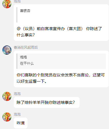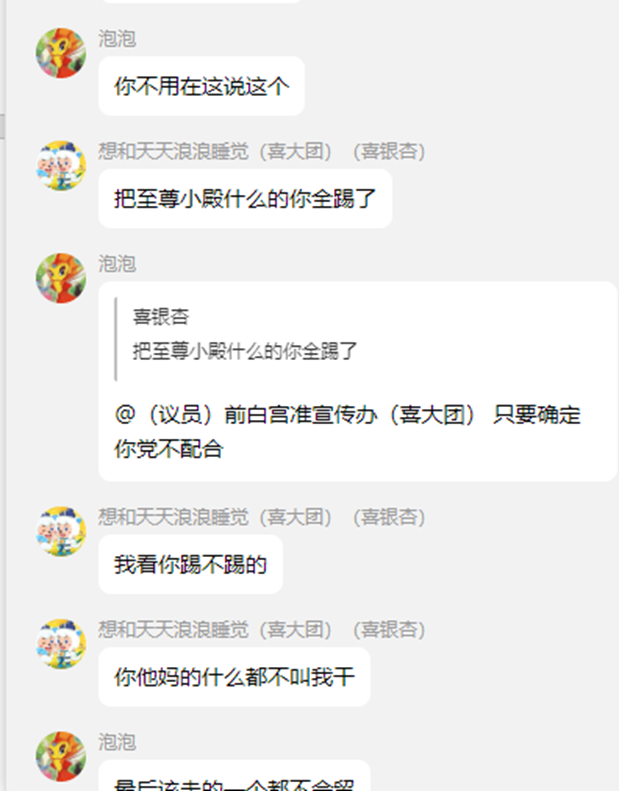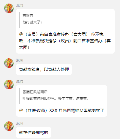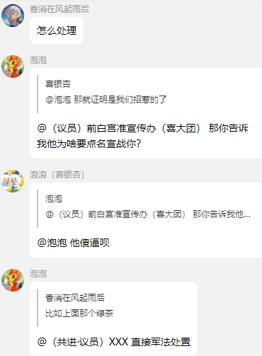 你们可知这话意味着什么?意味着:老子就是王,你们都得听我的,不准质疑我!敢质疑,直接给你扣上反动、造反、勾引反贼等等诸如此类的帽子。那么其他人是真的在造反吗?看图,喜银杏只是问了句“打过来了?“这本应该是询问事实的一句话,跟某鱼说的质疑决定又有何关联呢?别人打不打夜鸽这是夜鸽执 政的决定吗?啊!懂了,这些人打夜鸽是夜鸽执 政层的人指使来打自己的,背地里,只有这样,才能解释这话,很合理,这就是夜鸽自导自演的一出戏。