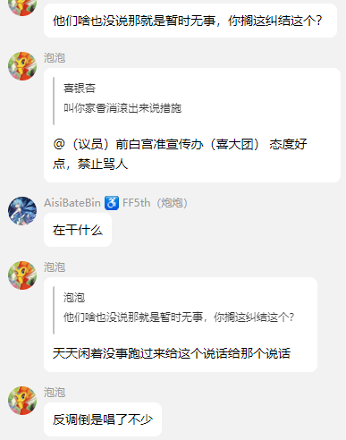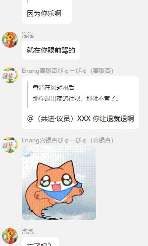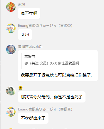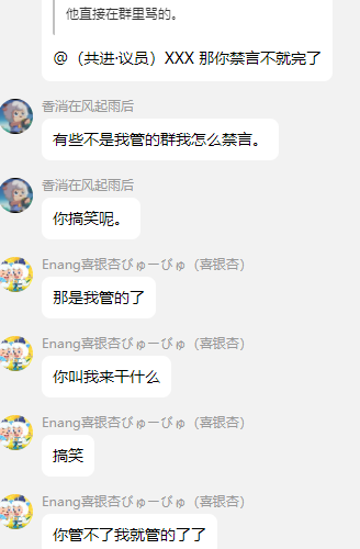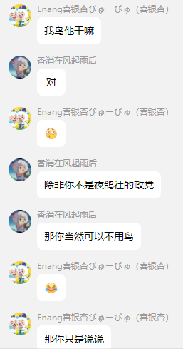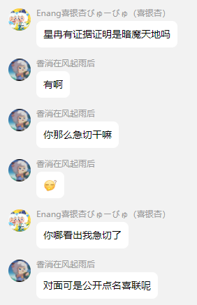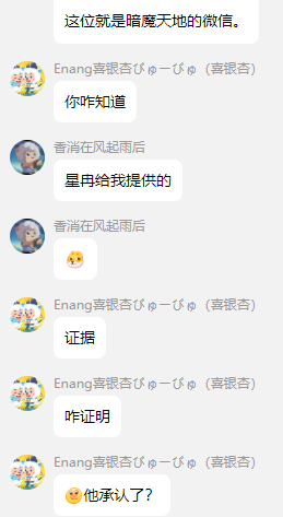 接着,这些对话一直在转移话题,并不敢直接把证据拿出来,反而说喜银杏急切,这说明了某香消喜心虚,在捏造事实,也就没有所谓的证据就在这凭空污蔑人,强制别人必须按照他们来,究竟是别人点名是喜联的招惹的还是你们自己把这伙攻击夜鸽的人的锅扣在喜银杏上?而喜银杏只是在喜联喜联也就顺便捆绑在一起道德绑架来让银杏顺从?没有充分证据情况下,你们夜鸽说的就百分百该信吗?谁知道是不是你们自己招惹的然后觉得自己不可能错就怪喜联、怪喜银杏、怪一切异己,甚至是扭曲事实来争取信徒呢?怪不得叫信徒喜,真爱主动制造“信徒”!