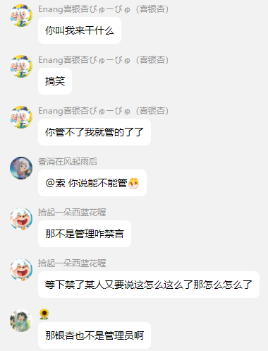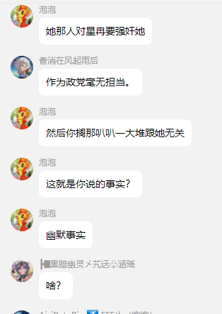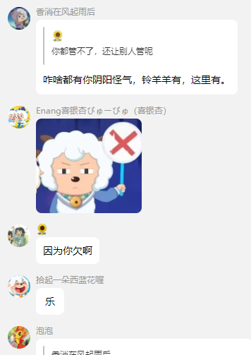 推卸责任最典型的,就是这明明自己的事,却非得把不相干的拉下水给自己垫背,这已经不能用缺德来形容了,用不是人形容都算高攀了。人家喜银杏又不是管理,把他叫过来能解决什么?这根本就是在推卸责任,只能体现出自己的无能,不想为自己的无能、管不了负责,怎么?制造信徒这么六也基本的管理都不会了吗?自己都管不了还让别人管算什么事?这句算阴阳怪气吗?不算,这无非就是看清了事实说了而已。还提完全不相干的铃羊羊阴阳怪气更是逮着任何不放过的机会疯狂黑是吧?铃羊羊在这事起到什么榜样作用吗?连个证据都不放的,纯抹黑造谣。往后的更离谱,铃羊羊这人强奸星冉是有的事吗?证据呢?没有证据就是在玷污别人清白,造谣生事,侵犯了别人的名誉权,难不成仅凭主观臆断事情就真的是这样吗?调查取证又不干,就凭空污蔑别人可真够六。