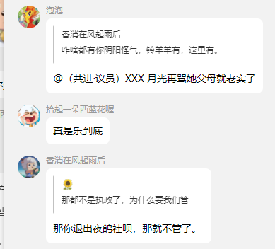我觉得这根本就没必要上升到不孝,而且月光也没骂茶茶父母,但凡骂了再说。我觉得之所以能扯上父母、扯上不孝,只是泡泡想用孝作为武器,来绑架茶茶必须按他们的来,要对夜鸽的敌人有敌意,要去干他们。如果被人骂自己父母还说自己是不孝,那换位一下呢?如果有人骂泡泡父母那泡泡也是不孝,这话本身就是有问题的,就是想通过给茶茶扣上“不孝”的帽子贬低茶茶来迫使她认同自己立场,必须一起谴责月光,不许“阴阳怪气”,这就是一种操纵,刺激茶茶愤怒与敌意,就是想把月光塑造成共同敌人来团结内部,而这也是独裁的一个显著特征:思想控制,塑造共同敌人。很显然,茶茶并没有被绑架到,而且还会怼回去。谁对谁错其实也不重要了,毕竟这些人也没几个真正讲道理的,总想着给人洗脑,制造信徒。