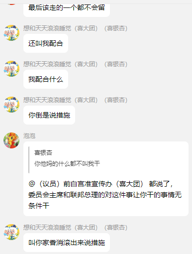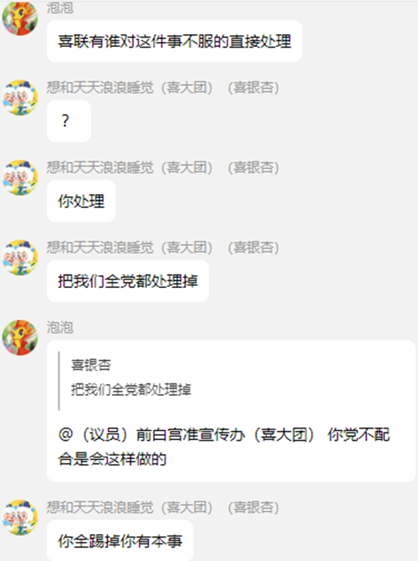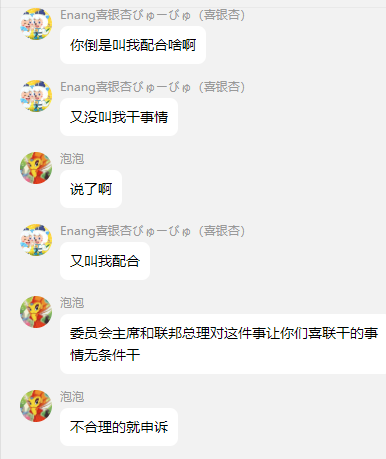 无条件配合是最不尊重他人意愿,最不把人当人的一种说法,这就是把喜联当傀儡的一个有力证明。只有自愿才能有无条件配合,或者是以绝对实力强迫,而且就连让干什么都没说只是一个劲让人配合,就是在故意刁难人。 泡泡是完全把喜联当傀儡使唤,居然还“有谁不服直接处理”,喜联又不是泡泡的,为什么要绕过银杏意愿来管里面谁服不服的?再者,这种处理方式处处透露着独裁、排除异己,完全就不是解决事情应有的态度,如果遇到事情只想解决人,那么人是解决不完的,反对的只会源源不断的诞生新的,只要不合理,就一定会出现,如果遇到一个不服自己的、不听话的砍一个,那么到最后全世界只能剩下自己,这是独裁者最终的下场。